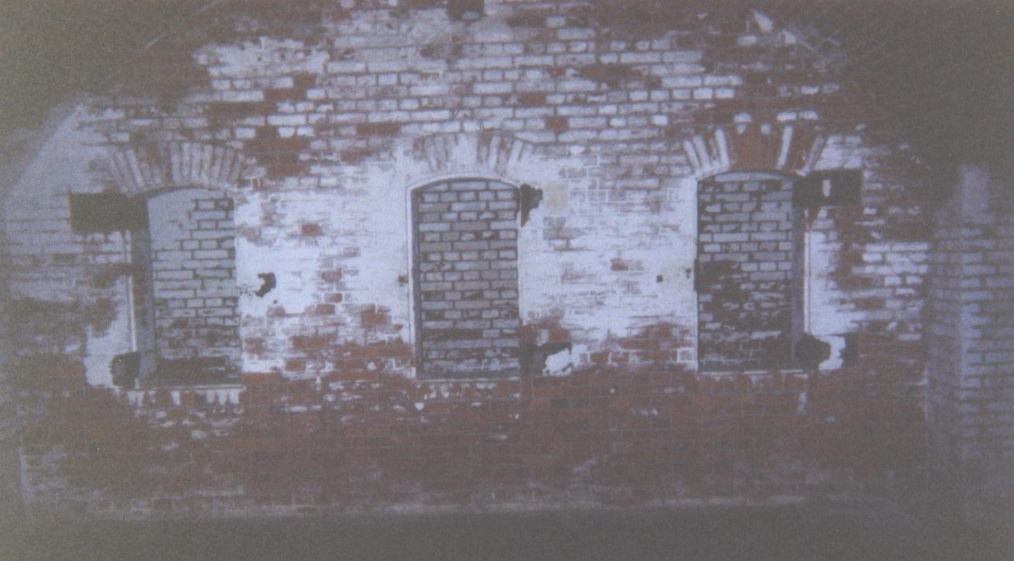 フラッシュ無しデジカメで撮影したので、写りが悪くてごめんなさいですが、「3つのへこみに見える窓」から入る外の光で、右の壁が照らされています。