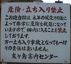 第2砲台跡にも看板(14612Byte)がありましたが、内容は「危険・立ち入り禁止」というものでした。長年の風化等により危険なので柵内に入るのは禁止。もし立ち入って事故となっても知らないよ。という物でした。
