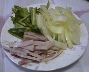 と言うことで、肉と野菜を刻んでいきます。やはりビーフンは細長い物だし、ビーフンと混ざり合いやすい&お箸とも親和性が高いようにということもあって、具になる野菜とハムも薄く細めに切っていきましたが、慣れていないこともあり非常に時間が掛かりました。つい、「クリムゾンで……」等という考えも頭をよぎりましたが、なんら解決にならないので、「刃物もまともに使えないなんて、あんなとがった針のような左手で傭兵として活躍されたコンバット越前様に笑われてしまう」と自らを奮い立たせ、下手ながら時間を掛けて我慢して切っていきましょう(笑)