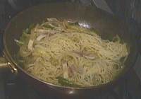 3 中火で約2分間蒸し焼きしてからビーフンを裏返し、軽くほぐして更にふたをして2分間待ちます。